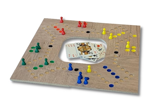 - ZEVEN: Deze kaart mag verdeeld worden over 4 pionnen. Indien je met je laatste pion naar binnen kunt en nog zetten over hebt, mag je deze zetten met een pion of pionnen van je maat spelen.